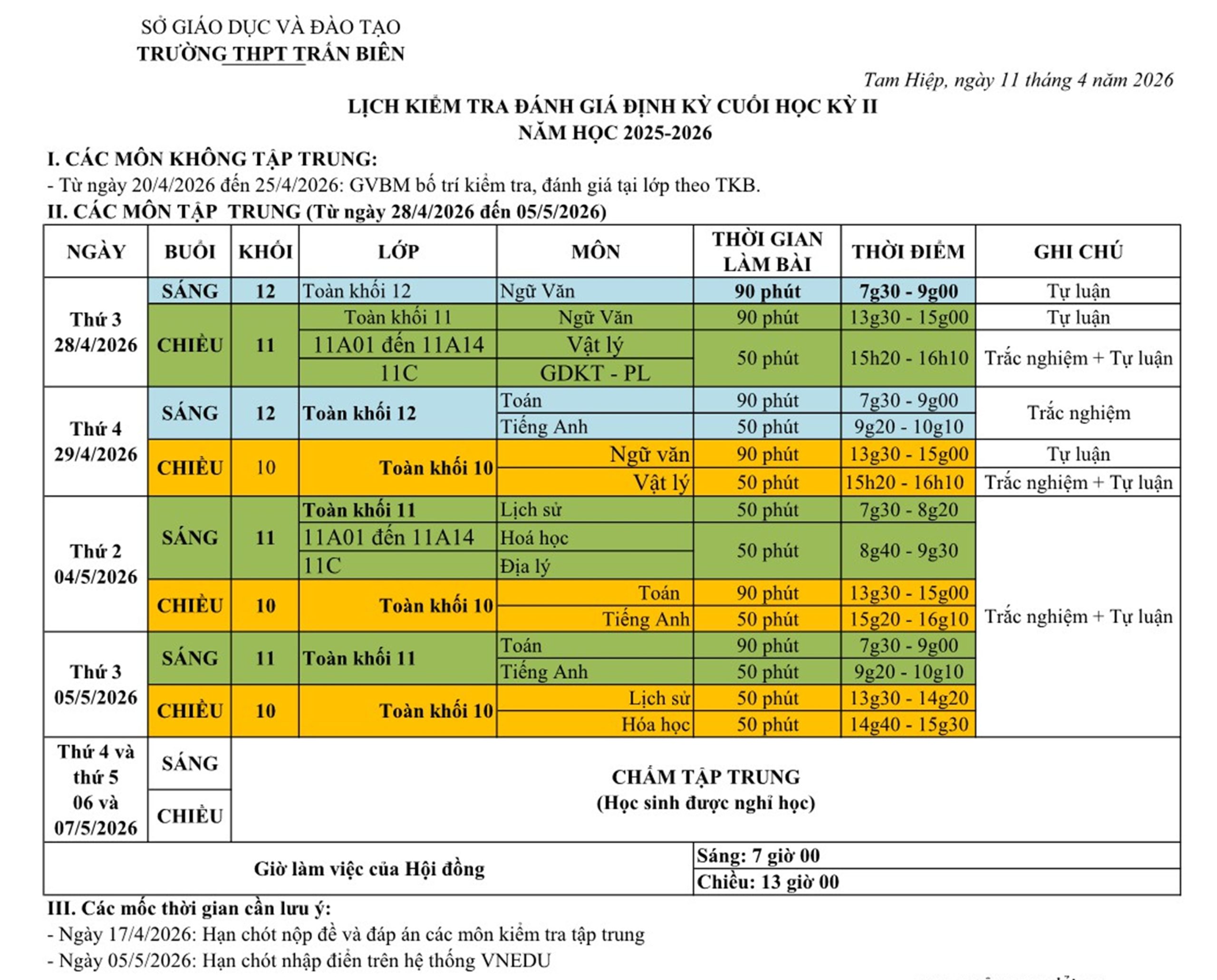 I. Lịch kiểm tra, đánh giá cuối HK II