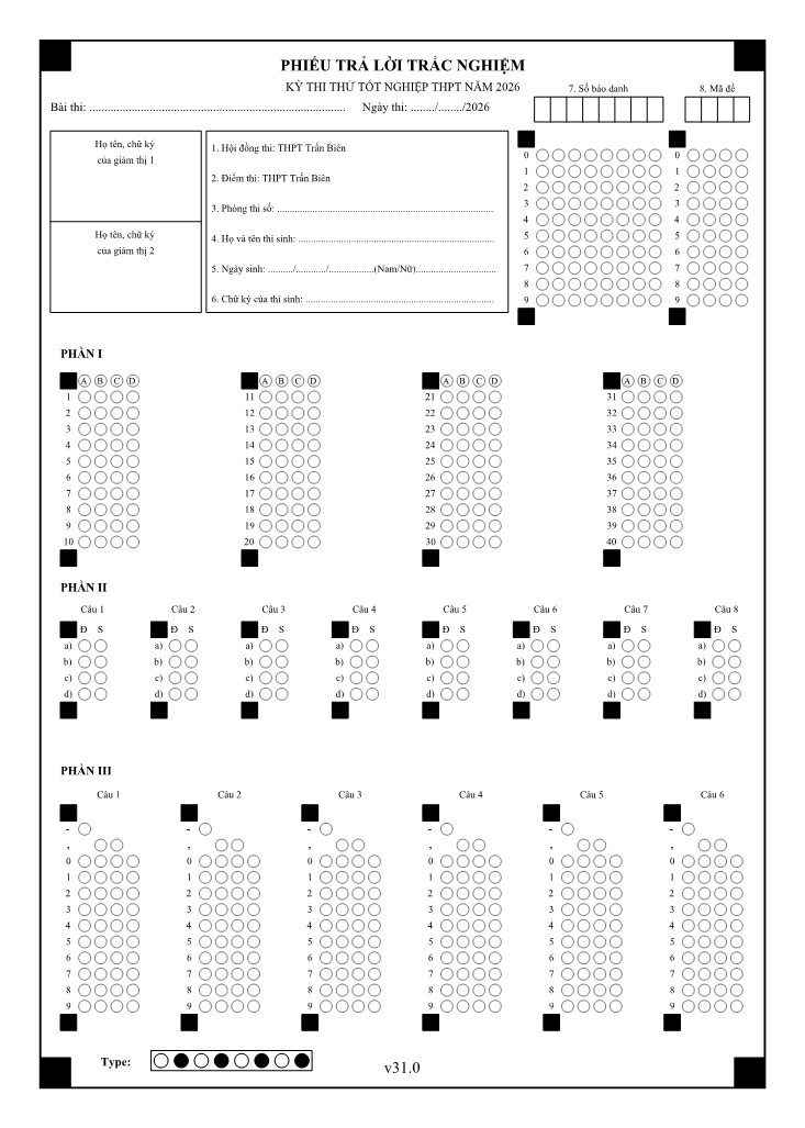 IV. Mẫu phiếu trả lời trắc nghiệm (Số báo danh: 08 chữ số. Mã đề thi: 04 chữ số)